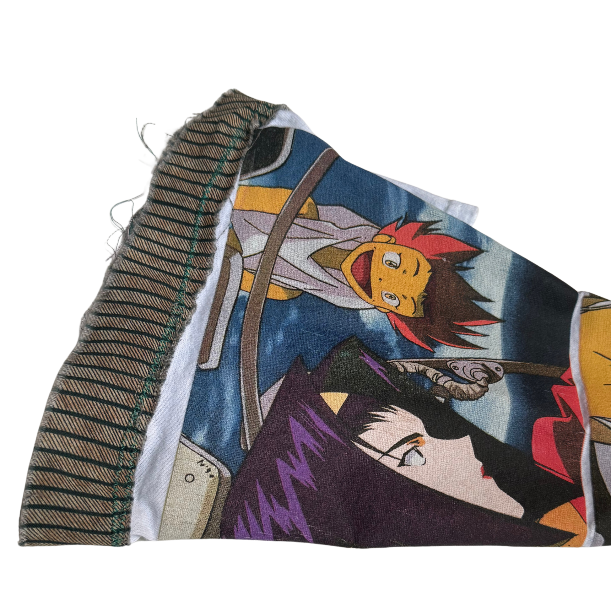 A white cotton crown with Cowboy Bebop artwork paired with a striped brim in dark greens and browns. Cinematic and moody.