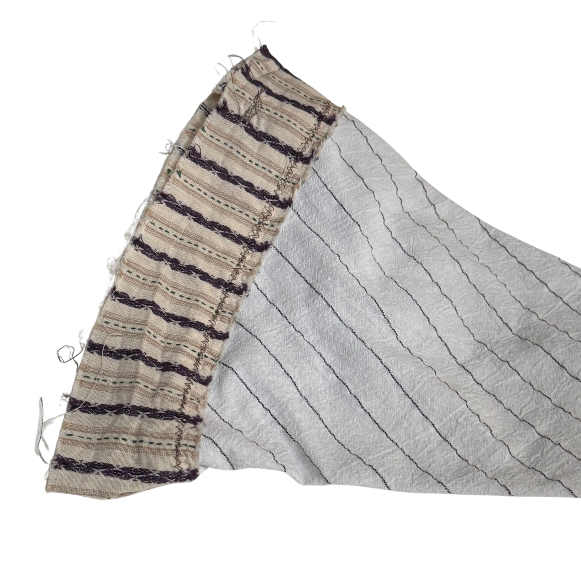 A cream crown paired with stripes in muted cream and dark accents. Balanced and soft, with frayed edges that feel weathered and natural.