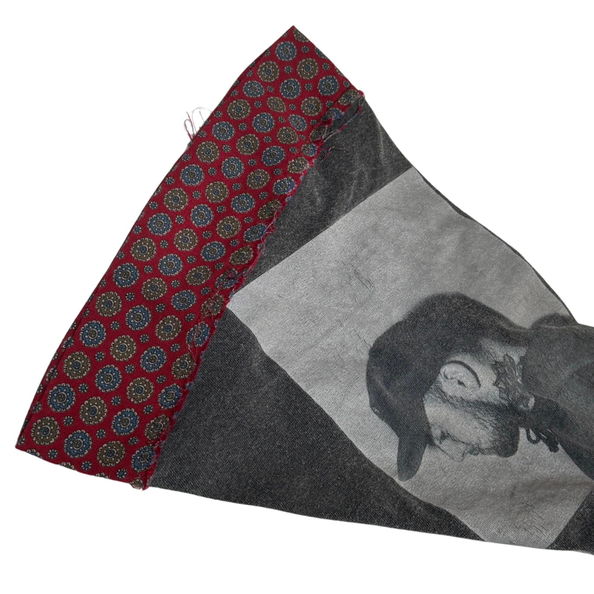 This one-of-one piece merges music and mood. The charcoal gray crown is cut from a cotton tee featuring a screen-printed portrait of Mac Miller in tonal grays, while the folded maroon brim carries a bohemian edge. Soft where it needs to be, structured where it matters.