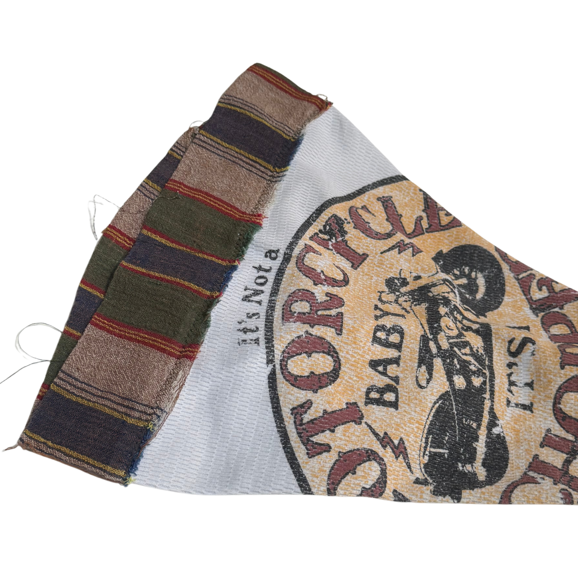 A crown of waffle cotton textured with a motorcycle graphic, paired with a folded brim striped in moody greens, purples, and reds. Rugged and rhythmic.