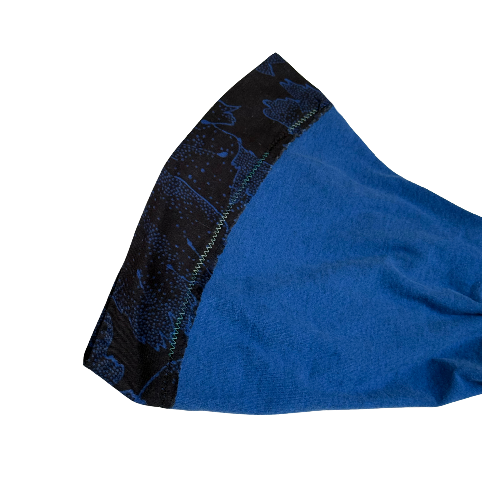 A vibrant royal blue crown paired with a folded brim patterned in subtle florals over black. Bold but softened, regal with hidden quiet.