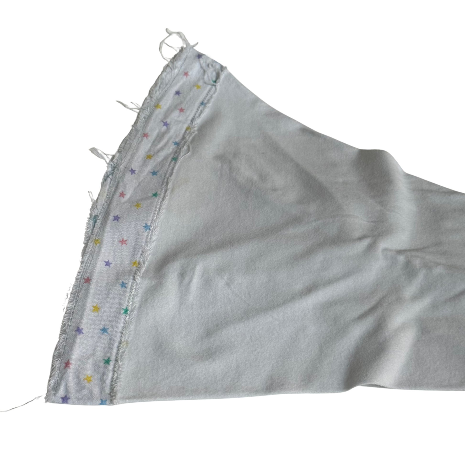 White cotton scattered with pastel rainbow stars and a fuzzy brim that feels like confetti falling in slow motion.
