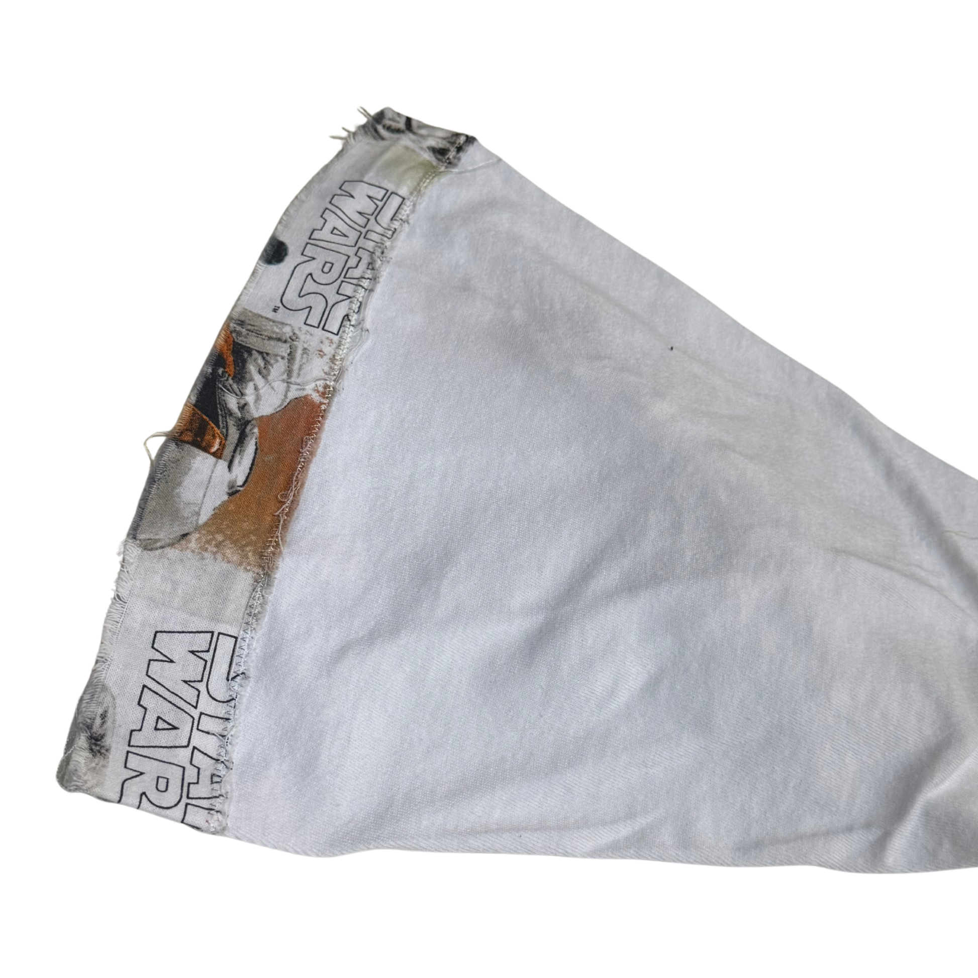 A clean white crown paired with a frayed brim illustrated with classic Star Wars characters and the iconic logo. Lightweight and raw edged.