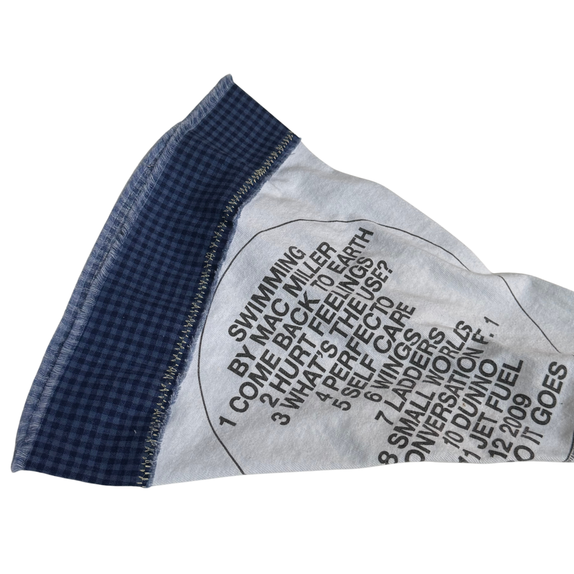 A quiet tribute to rhythm and reflection. The crown carries Mac Miller’s tracklist in crisp black on white, paired with a raw navy checkered brim.